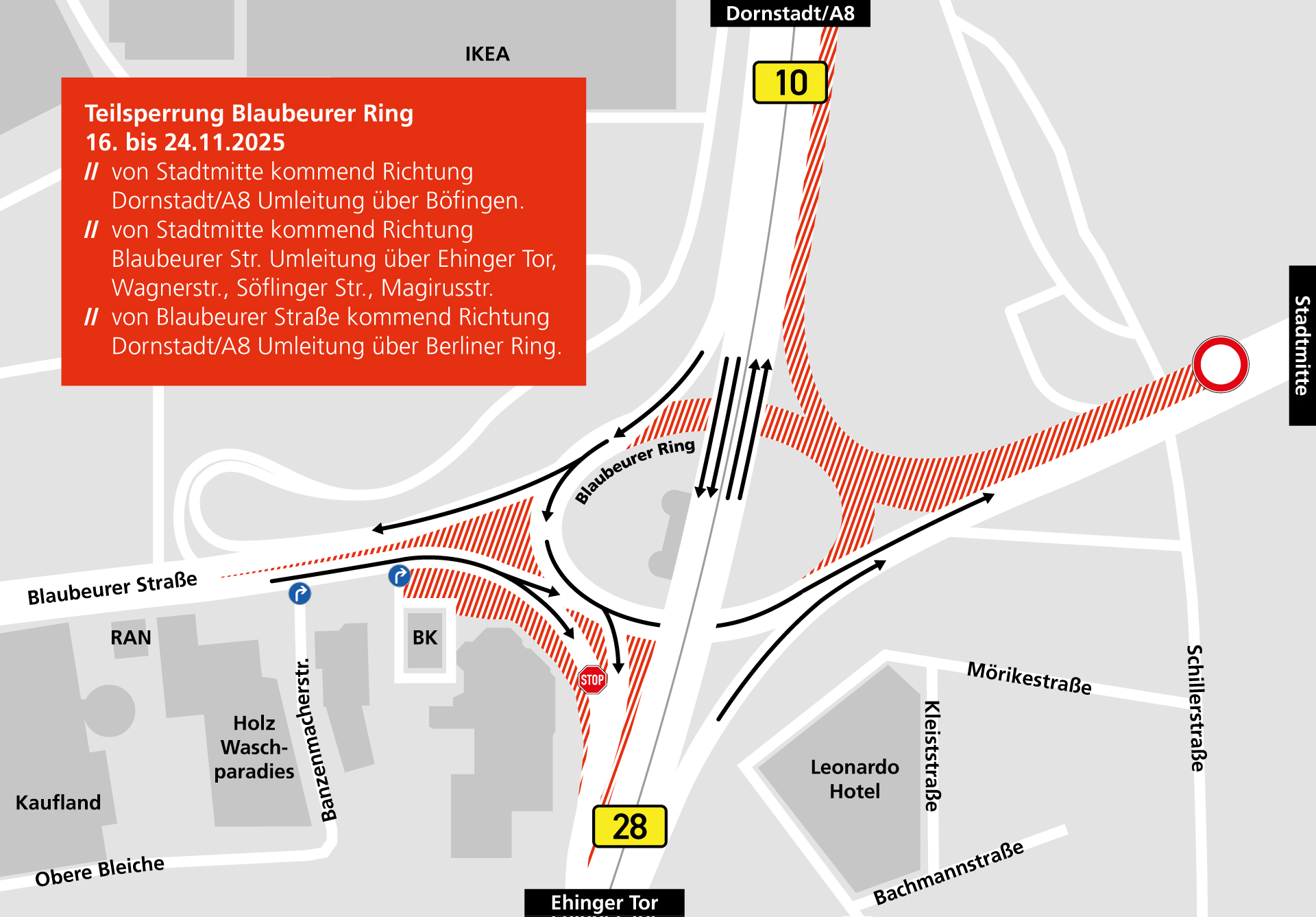 Im Zuge der laufenden Bauarbeiten am Blaubeurer Ring ist von Sonntag, 16. November, bis Montag, 24. November 2025, eine Sperrung des nordöstlichen Teils des Blaubeurer Rings erforderlich. Am Sonntag, 23. November 2025, kommt es zeitweise zur Vollsperrung des gesamten Kreisels.