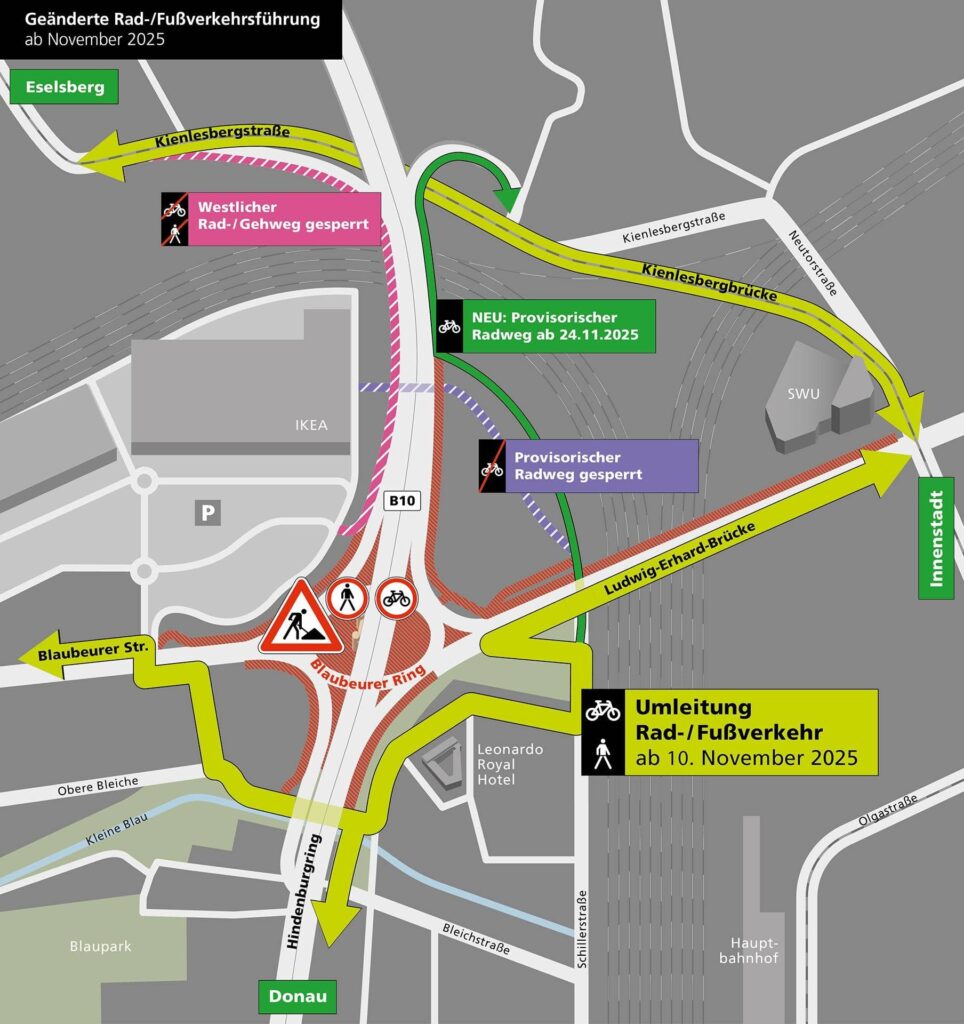 Ab Freitag, 28.11.2025 (21 Uhr), wird die B10 Richtung Süden zwischen Ausfahrt Wissenschaftsstadt und Ausfahrt Stadtmitte bis Ende 2029 gesperrt sein. Die Wallstraßenbrücke wird in dem Zeitraum erneuert und die Blaubeurer Tor-Brücke durch einen Tunnel ersetzt. Gleichzeitig wird auch der Ringverkehr am Blaubeurer Tor aufgelöst und in zwei mit Ampelanlagen gesteuerte Kreuzungen umgebaut. Am Blaubeurer Tor ist die Auffahrt Richtung Süden (Neu-Ulm) weiterhin möglich. Richtung Norden ist die B10 während der gesamten Bauzeit zweispurig.